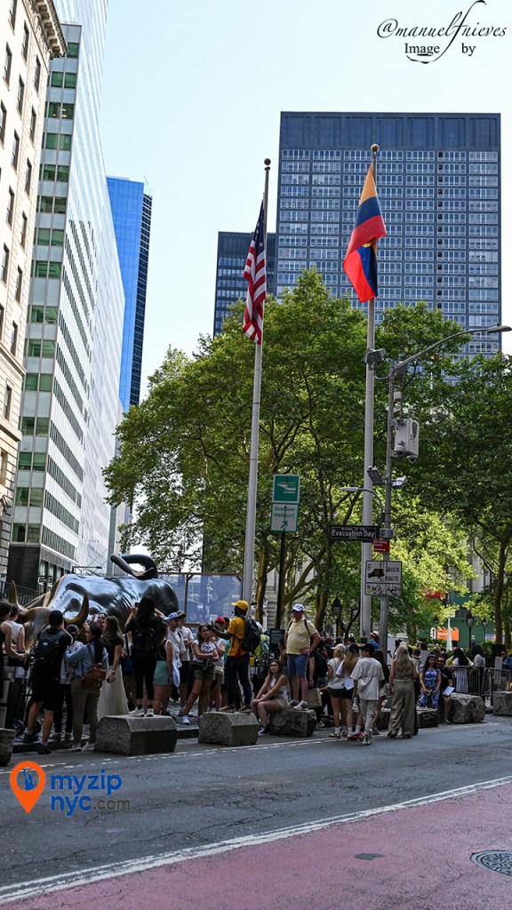 La ceremonia estuvo acompañada de presentaciones folclóricas que llenaron de color la plaza, ondeando polleras y sombreros tradicionales al ritmo de la música ecuatoriana, en contraste con los rascacielos y el icónico Toro de Wall Street. El momento más emotivo llegó cuando, entre aplausos y vivas, el pabellón tricolor ascendió por el mástil, ondeando junto a la bandera de Estados Unidos, símbolo de la unión entre dos naciones a través de su gente.